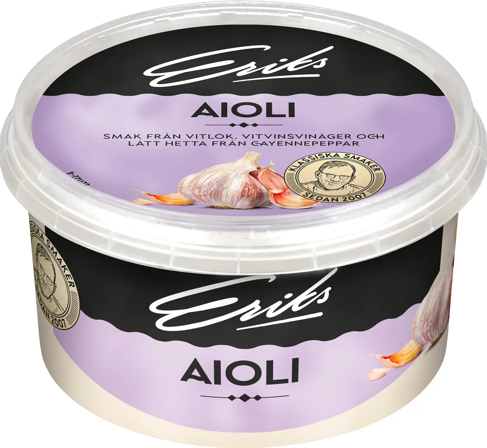 Eriks Aioli med smak från vitlök, vitvinsvinäger och lätt hetta från cayennepeppar. Såsen är len och krämig med en rund och fyllig smak. Det är en sås som passar perfekt till höstens varma fiskgrytor, färska skaldjur eller varför inte till en grillad laxfjäril! Eriks Aioli är även ett utmärkt tillbehör till räkor, en varm baguette och ett glas fruktigt vitt vin.