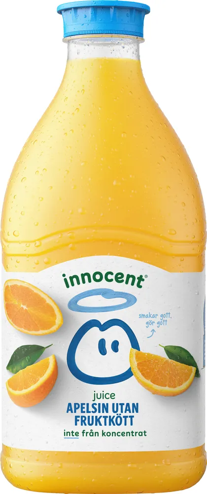 Apelsinjuice utan fruktkött tillverkas av Innocent.