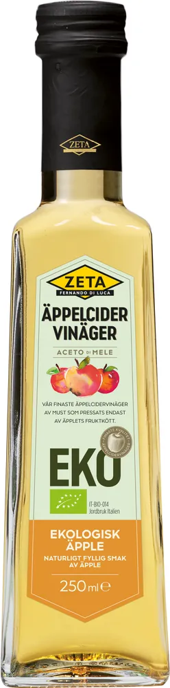 Zeta Äppelcidervinäger Ekologisk framställs i Italien på traditionellt vis: saften av solmogna äpplen får jäsa till cider, som sedan långsamt övergår till en härligt aromrik vinäger. Den naturliga processen gör att den friska, fylliga äppelsmaken bevaras till fullo. Utmärkt till allt från rostade grönsaker till äppeldesserter.