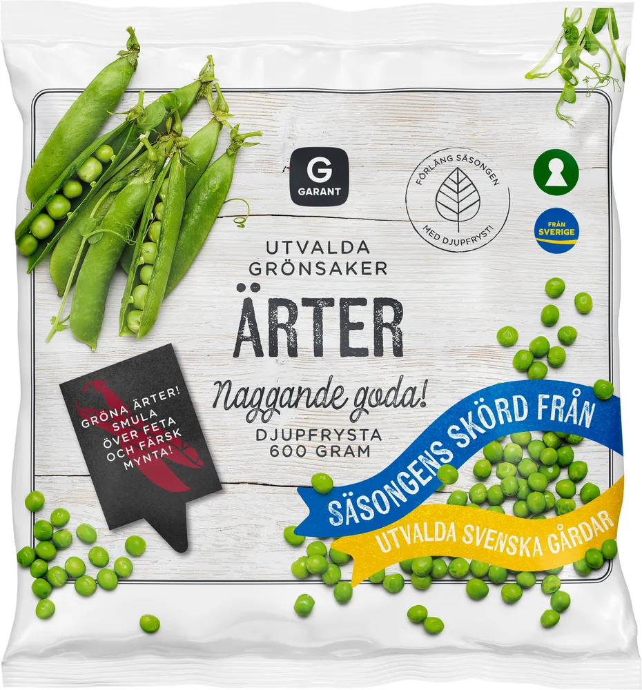 Säsongens skörd av naggande goda ärter från utvalda svenska gårdar. Djupfrysta. 600 gram.