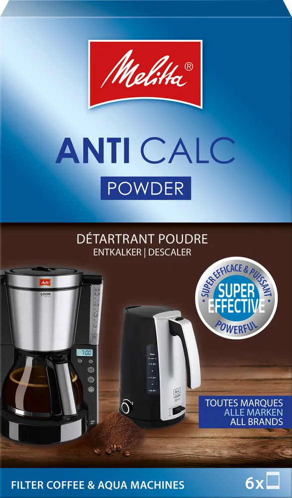 Behåll kaffets karaktär och öka livslängden på din kaffebryggare. Kaffebryggare, vattenkokare och helautomatiska kaffemaskiner bör avkalkas och rengöras ungefär var 40:e användning, beroende på vattnets hårdhet. Melittas avkalkningsmedel är anpassade efter olika maskiners känslighet och finns i tablettform, som pulver och i flytande form. Melitta avkalknings- och rengöringsmedel fungerar lika bra till alla fabrikat. ANTI CALC Filter Café Machines (avkalkningspulver) Effektivt och starkt avkalkningspulver för kaffebryggare. Ger kaffet bättre smak och ökar livslängden på kaffebryggaren.