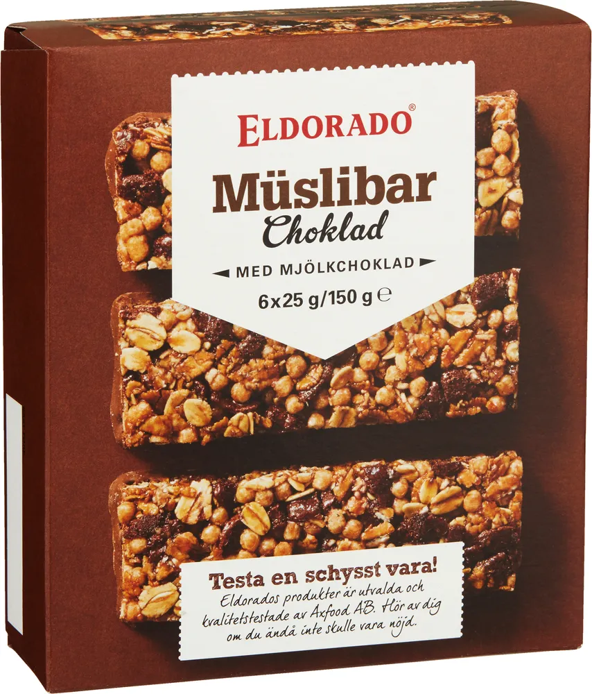 Muslibar med chokladbitar och mjölkchoklad överdrag. 6x25 gram.