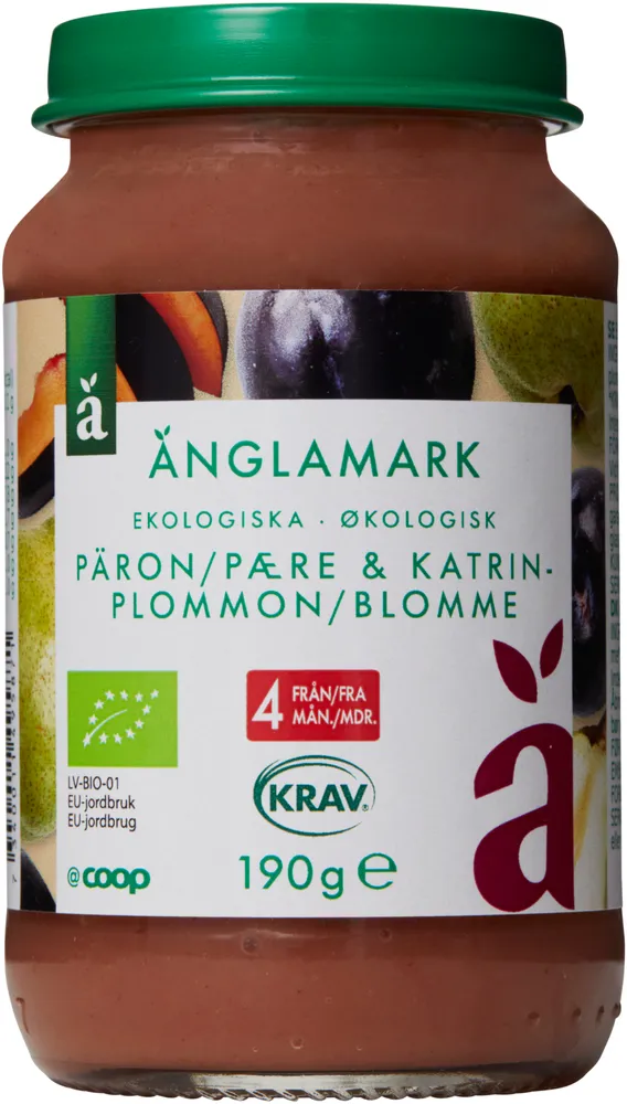 INGREDIENSER: Päron* 40% (Italien och/eller Spanien), katrinplommon* 38% (Italien och/eller Spanien), vatten, rismjöl*.*KRAV- ekologisk ingrediens.KRAV-märkningen verifieras av Intertek.Innehåller inte gluten.