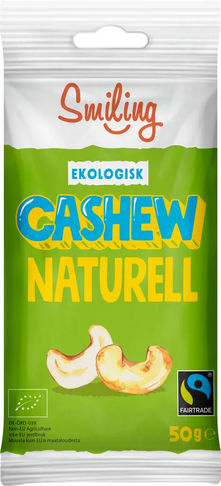 Smilings naturella cashewnötter odlas på Afrikas västkust av Adja, Jacob, Yaoua och de andra bönderna. Nötterna är ekologiska och Fairtrade-märkta. Inga konstigheter, bara schyssta cashewnötter som är bra både för dig och bonden! När du väljer Smilings goda cashewnötter är du med och skapar hållbar utveckling i odlingsländerna. Du gör gott samtidigt som du äter gott!