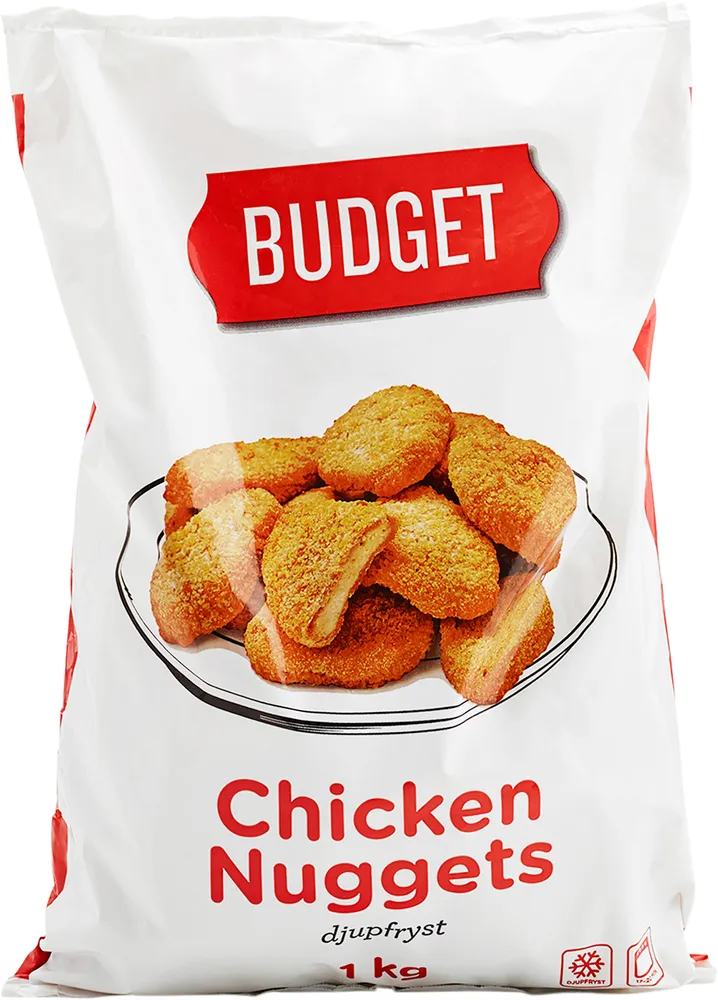 Kycklingkött 44%, _vetemjöl_, vatten, rapsolja, _vetestärkelse_, majsmjöl, salt, modifierad _vetestärkelse_, bakpulver (E500, E450), druvsocker, jäst, jästextrakt
