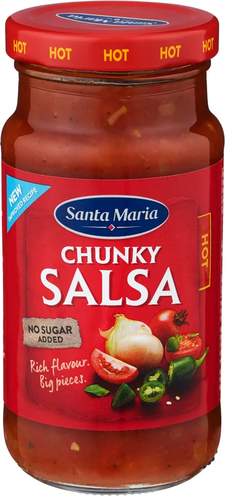 Het salsa med mycket tomat, och smak av lök, chili, jalapeño samt andra kryddor och örter. Santa Maria Chunky Salsa Hot tillför bitig textur och angenäm hetta till tacos, nachos och annan mexikansk festmat. Många använder även denna klassiska salsa till hamburgare, grillad kyckling och i färsrätter som chili con carne. • Het och fyllig salsa till Tex Mex, tacos och annan mexikansk mat • Perfekt salsa till fest, kalas och fredagsmys • Även lämplig till vegan, vegetarisk bjudmat
