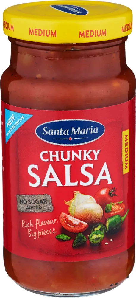Santa Maria Chunky Salsa Medium är en salsasås med en härlig kombination av tomatsmak, chili, jalapeño och lök. Santa Maria Chunky Salsa Medium ger en tjock textur och ger en behaglig hetta till tacos, nachos och andra mexikanska rätter. Många använder även denna klassiska salsa till hamburgare, grillad kyckling och köttfärsrätter som chili con carne. • Medelstark och fyllig salsa för Tex-Mex-rätter, tacos och andra mexikanska rätter • Den perfekta salsan för familjekvällar och fester • Lämplig för vegansk matlagning och vegetariska rätter