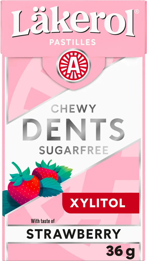 Läkerol Dents Strawberry är en mjuk och sockerfri tuggpastill med smak av jordgubb och mild mint. Pastillen innehåller 50% xylitol som bidrar till en fräsch känsla i munnen. Dessutom bidrar intag av pastiller som innehåller xylitol och maltitol i stället för sockerarter till att bibehålla tändernas mineralisering. Ta två av Läkerol Dents Strawberry efter varje måltid. Innehåller 36 g. Läkerol - Makes people talk