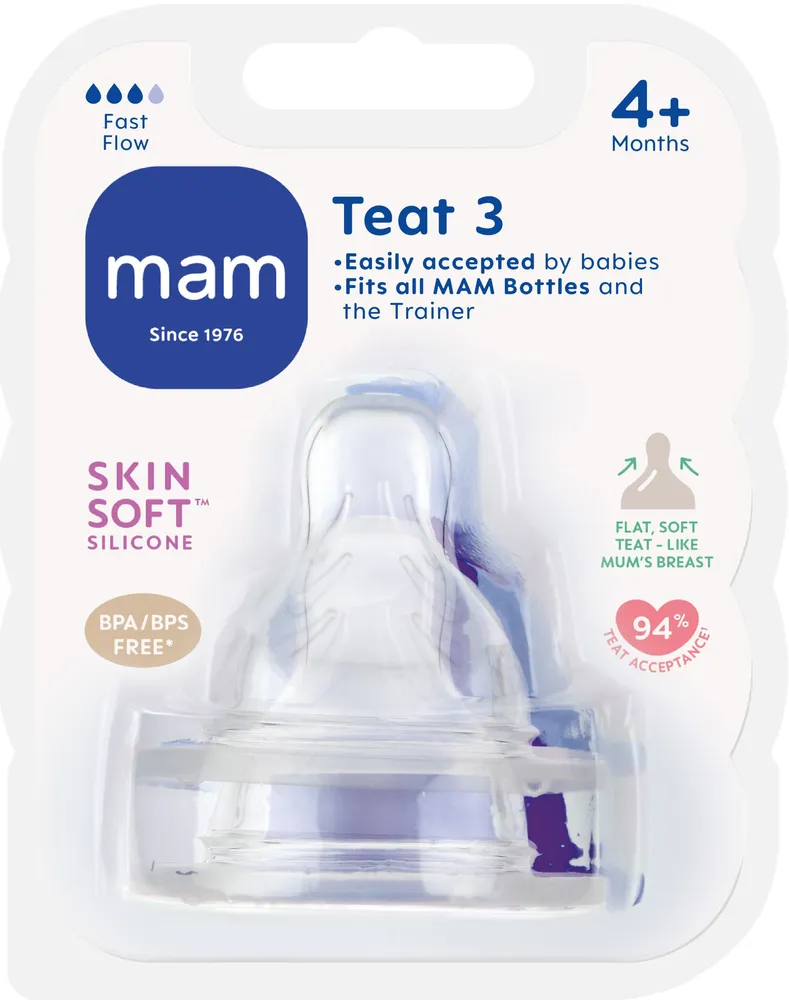Dinapp med silkeslen silikon, MAM SkinSoft, vars yta påminner om mammas hud och gör det lätt att växla mellan amning och flaska. Storlek 3 är för modersmjölksersättning och välling. Passar alla flaskor från MAM.