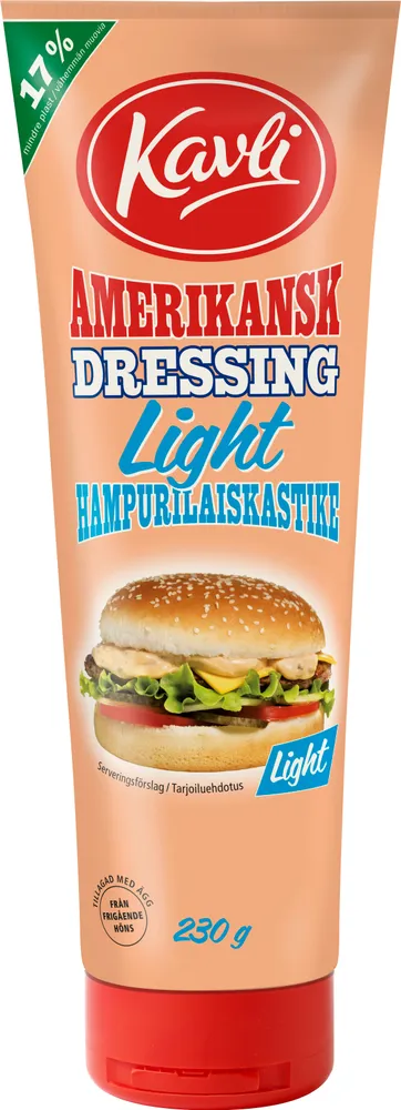 Kavli Amerikansk dressing Light är en riktig familjefavorit med 56% mindre fett än originalet. Det är en krämig dressing som görs omsorgsfullt med krispig gurka och gyllene rapsolja. Kavli Amerikansk dressing tillagas i Älvsjö med ägg från frigående höns. Kavlis Amerikanska dressing Light passar självklart perfekt till hamburgare men är lika god till pasta och sallad.