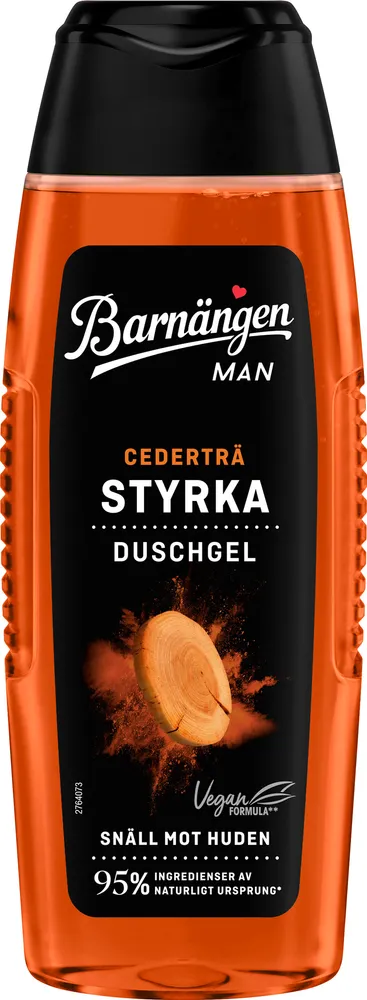 BARNÄNGEN MAN STYRKA är en stärkande duschgel för kropp och hår. Vegansk formula som lämnar en mjuk och len känsla. Med djup doft av cederträ. 95% ingredienser av naturligt ursprung (inkl vatten). Flaska gjord av 100% återvunnen plast exkl. lock. Kan användas dagligen och dermatologiskt testad.