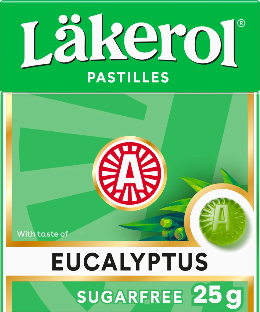 Läkerol Eucalyptus har en fyllig smak och är extra uppfräschande när du har ont i halsen. Pastillen är både sockerfri och lenande för halsen.