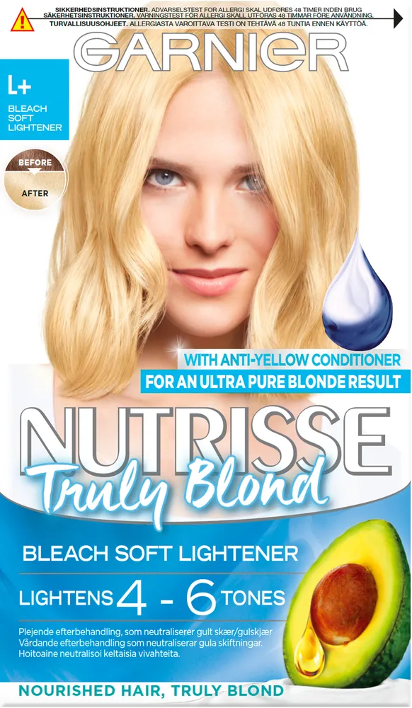 Nutrisse Truly Blond från Garnier är en bred serie produkter utvecklade för att ge vackra blonda hårfärger. Utforska de extra uppljusande permanenta hårfärgerna som både bleker och färgar, blonderingar som bleker upp till 8 toner, våra slingkit samt specialprodukter som spray och balsam som motverkar gula toner.110_111+_Anti-yellow conditioner: INSTRUKTIONER: HÅRFÄRG KAN ORSAKA ALLVARLIGA ALLERGISKA REAKTIONER. • Läs och följ bruksanvisningen. • Produkten är inte avsedd att användas på personer under 16 år. • Temporära tatueringar med svart henna kan öka risken för allergier. • Färga inte håret om: - du har utslag i ansiktet eller känslig, irriterad och skadad hårbotten - du tidigare har reagerat på en hårfärgningsprodukt - du tidigare har reagerat på en temporär tatuering med svart henna. S1_L+_L++_L+++: B++/B+++ VIKTIGT: PRODUKTEN INNEHÅLLER PERSULFAT OCH KAN FRAMKALLA EN ALLERGISK REAKTION SOM I VISSA SÄLLSYNTA FALL KAN VARA ALLVARLIG. DET ÄR DÄRFÖR ABSOLUT NÖDVÄNDIGT ATT RESPEKTERA FÖLJANDE INSTRUKTIONER: • FÅR EJ ANVÄNDAS OM: -Du är överkänslig för persulfat eller tidigare har reagerat på en blonderings- eller avfärgningsprodukt. -Din hårbotten är känslig, irriterad eller skadad. • Samråd med läkare om du har några frågor som rör din personliga känslighet. Lightening spray: INSTRUKTIONER: • Innehåller väteperoxid. • Undvik kontakt med ögon och kläder. • Vid kontakt med ögonen, skölj genast med rikligt med vatten. • Använd skyddshandskar.