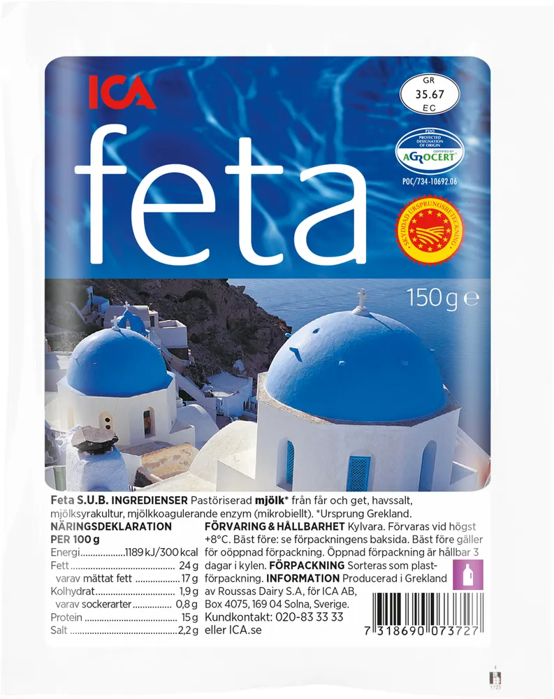 Fetaost ifrån ICA är en P.D.O-skyddad ost som betyder att den är tillverkad enligt traditionella metoder i Grekland. Den har den karaktäristiska salta smaken med en mjuksmulig konsisten som äkta feta har. Passar perfekt till de flesta rätterna och salladerna.