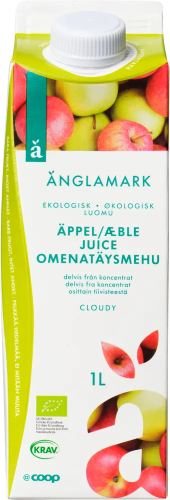 INGREDIENSER: Ekologisk äppeljuice** från koncentrat 75%, ekologisk ofiltrerad äppeljuice** 25%. **KRAV-ekologisk ingrediens. KRAV-märkningen verifieras av KIWA. Äpplenas ursprung: Se kod vid Bäst före-datumet. DE=Tyskland, UA=Ukraina, IT=Italien, HU=Ungern, PL=Polen.