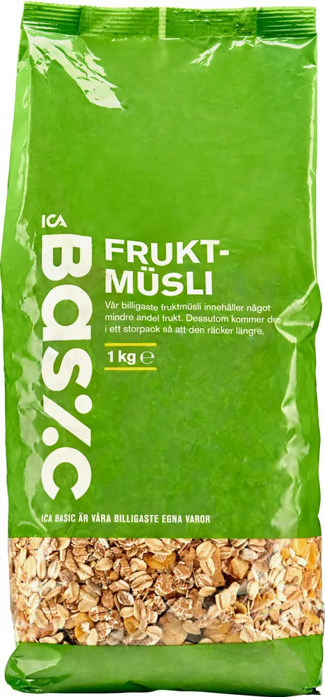 Fruktmüsli tillverkas av ICA Basic.