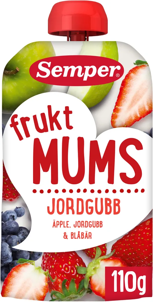 Klämmis med 100 % frukt och bär, inget annat! Semper Fruktmums med jordgubb, äpple och blåbär är ett praktiskt mellanmål i klämpåse. Lätt att äta utan kladd och spill och enkel att ta med sig. Semper Fruktmums är en len fruktsmoothie med fräsch och mumsig fruktsmak som passar perfekt till mellis eller en mysig fruktstund. Servera gärna klämmisen från sked. Ren puré av frukt och bär för barn från 6 månader.