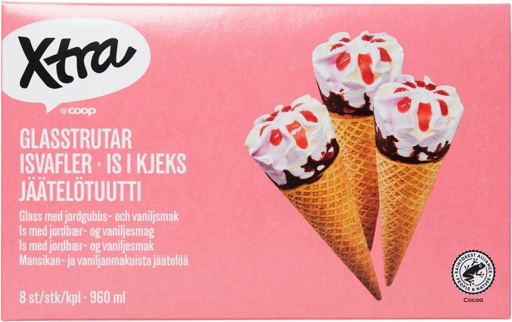 Glasstrutar Vanilj & Jordgubb 8-p tillverkas av Coop Xtra.