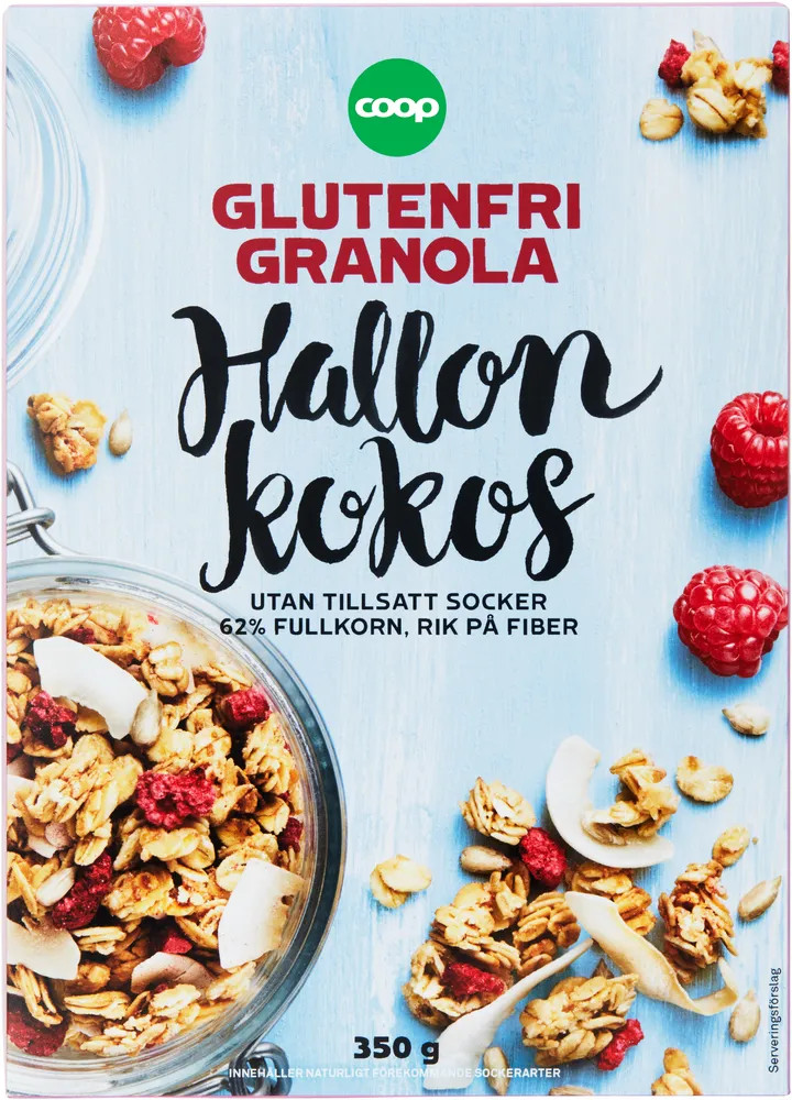 Glutenfri Granola hallon och kokos tillverkas av Coop.