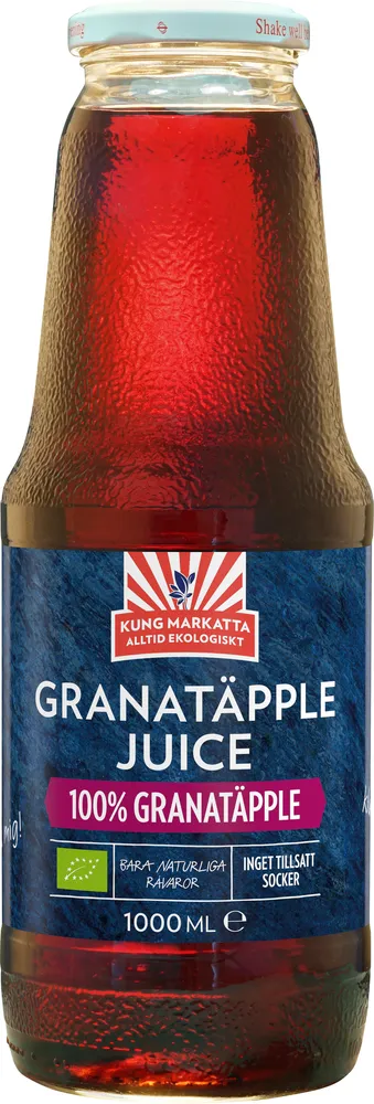 Kung Markattas ekologiska granatäppeljuice är fräsch och frisk i smaken. Den består av 100% pressade ekologiska granatäpplen och har inget tillsatt socker. Njut den som den är eller använd den i smoothies och matlagning.