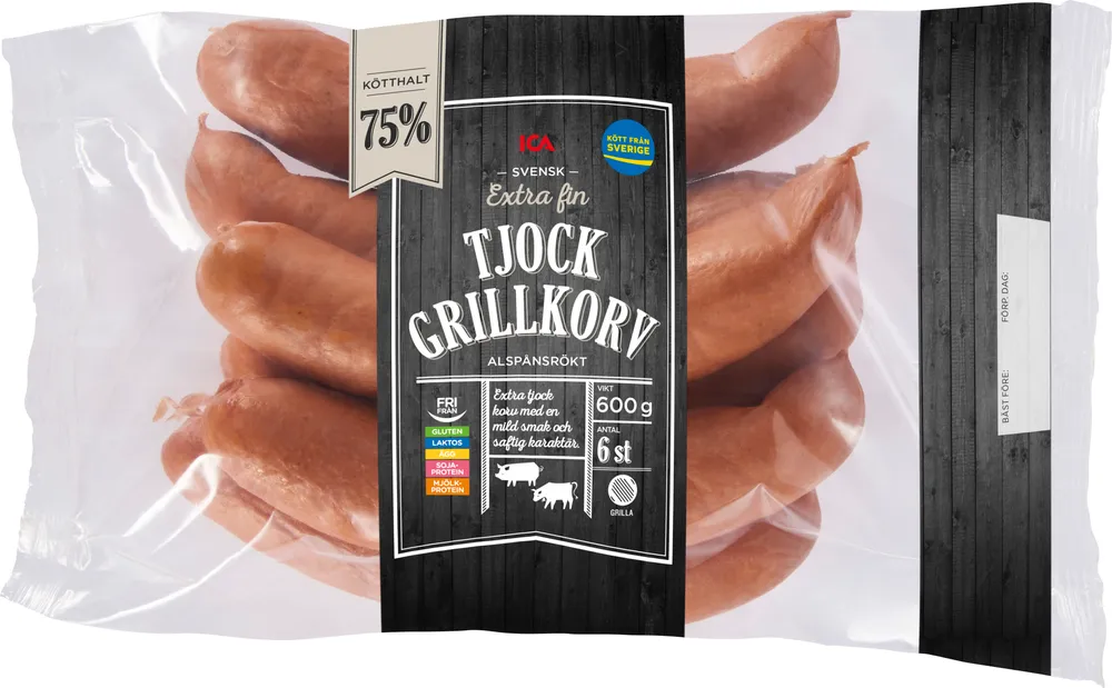 Grillkorv Extra Fin Tjock Korv tillverkas av ICA.