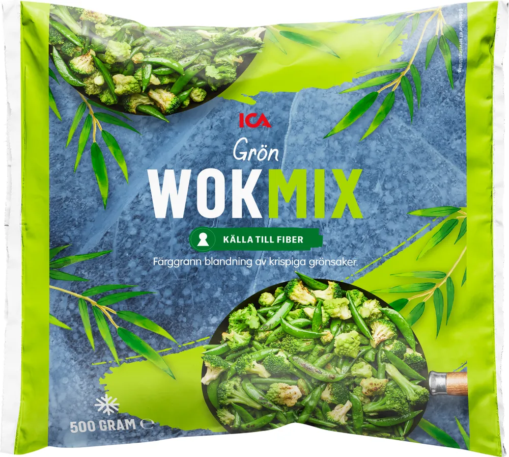 Broccolibuketter 30%, gröna bönor 30%, brytsockerärter 20%, romanescobuketter 20%.