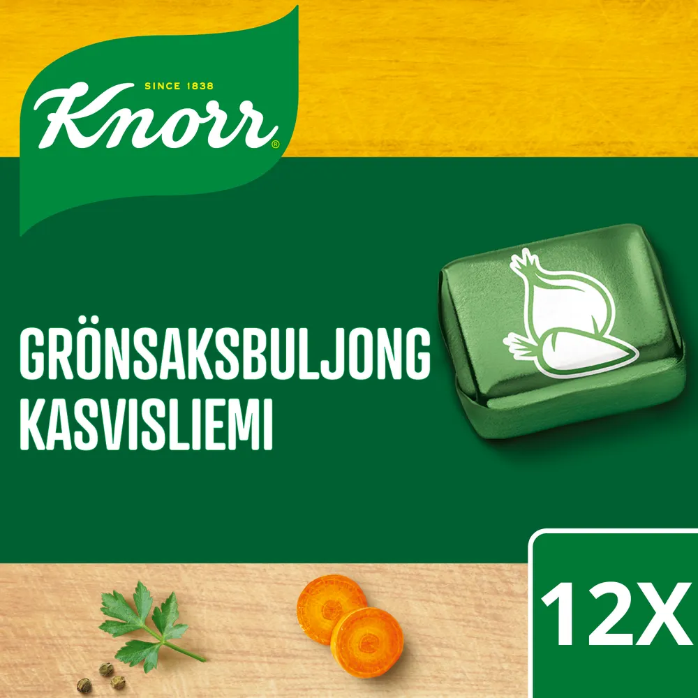 Knorr Grönsaksbuljong Tärning 12x10 g är smakrik grönsaksbuljong som med utvalda örter och kryddor snabbt hjälper dig tillreda enkel vegetarisk mat som smakar bra! Använd Knorr Grönsaksbuljong som bas till grytor, soppor, marinader och såser för att lyfta smakerna till högre höjder. Passar perfekt till en vegetarisk middag, som exempelvis en god vegetarisk stroganoff. En vegetarisk soppa som potatis- och purjolökssoppa, sparrissoppa eller ramen. Låt en buljongtärning ersätta salt i vattnet när du kokar ris, pasta eller grönsaker. Perfekt till mat för vegetarianer. Knorr Grönsaksbuljong är MSG-fri och finns i 6-, 10-, 12- och 18- pack, där 12 tärningar ger 6 liter buljong. Hög kvalitet och smakrik mat är Knorrs passion! Därför strävar vi, våra kockar och experter alltid efter att utveckla och ta fram nya och spännande produkter för att göra din matupplevelse extra härlig. En av våra starkaste sidor är att vi har en bred kunskap om de lokala smakerna, trots att vi är ett så stort och globalt varumärke. Under decennier har vi arbetat för att skapa produkter med hög kvalitet, gjord på de allra bästa råvaror och ingredienser. Vår kärlek till mat är det som driver oss, och vårt mål är att hjälpa dig att laga god, enkel och hälsosam mat med mycket smak. Det är just vår passion för högkvalitativ och smakrik mat som också leder oss mot en ny framtid. En framtid där vårt samhälle och vår miljö står i centrum, och där alla våra grönsaker och råvaror ska komma ifrån hållbara jordbruk.