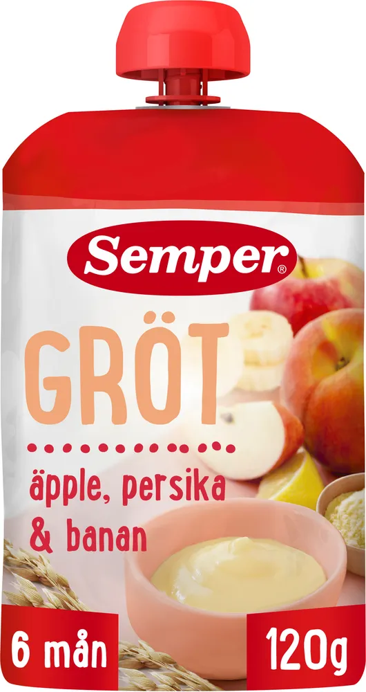 Gröt äpple & persika Från 6M tillverkas av Semper.