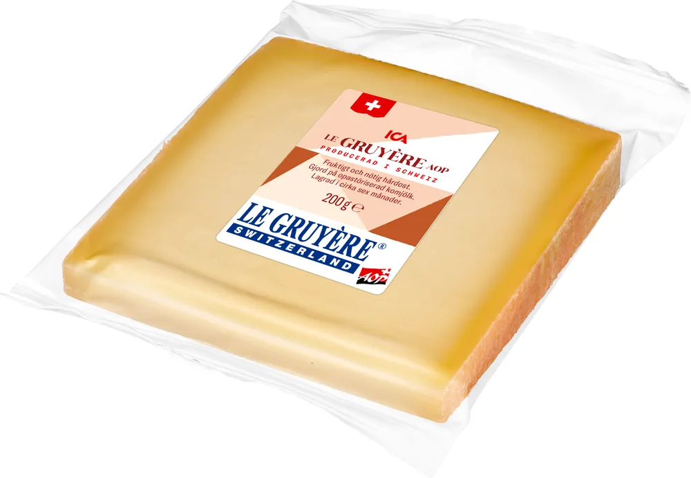 Gruyere från ICA:s egna sortiment är lagrad i 5-6 mån. Gruyere började tillverkas och tillverkas än idag med speciella metoder i de schweiziska bergen. Gruyere innehåller ren opastöriserad råmjölk utan några tillsatser. Gruyere har en fyllig och mogen smak som passar lika bra till både matlagning som till ostbrickan.
