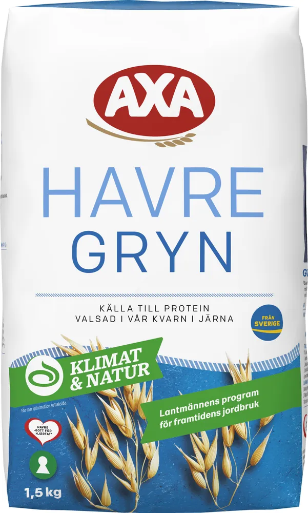 AXA Havregryn är en älskad favorit som kan användas som bas till allt från goda frukostar som gröt, müsli och granola till läckra bakverk. Våra älskade havregryn är fullproppad med fullkorn, rik på mineralerna järn och zink samt vitaminerna tiamin och folsyra. Inte konstigt att havregryn är en svensk klassiker. Våra havregryn är dessutom odlade och producerade i Sverige samt nyckelhålsmärkta! Dessa havregryn är en del av Lantmännens Klimat & Natur odlingsprogram, från havre som är odlat med lägre klimatpåverkan. Det innebär att när du väljer att använda dessa havregryn bidrar du till att Lantmännen kan odla spannmål med mer hållbara metoder.