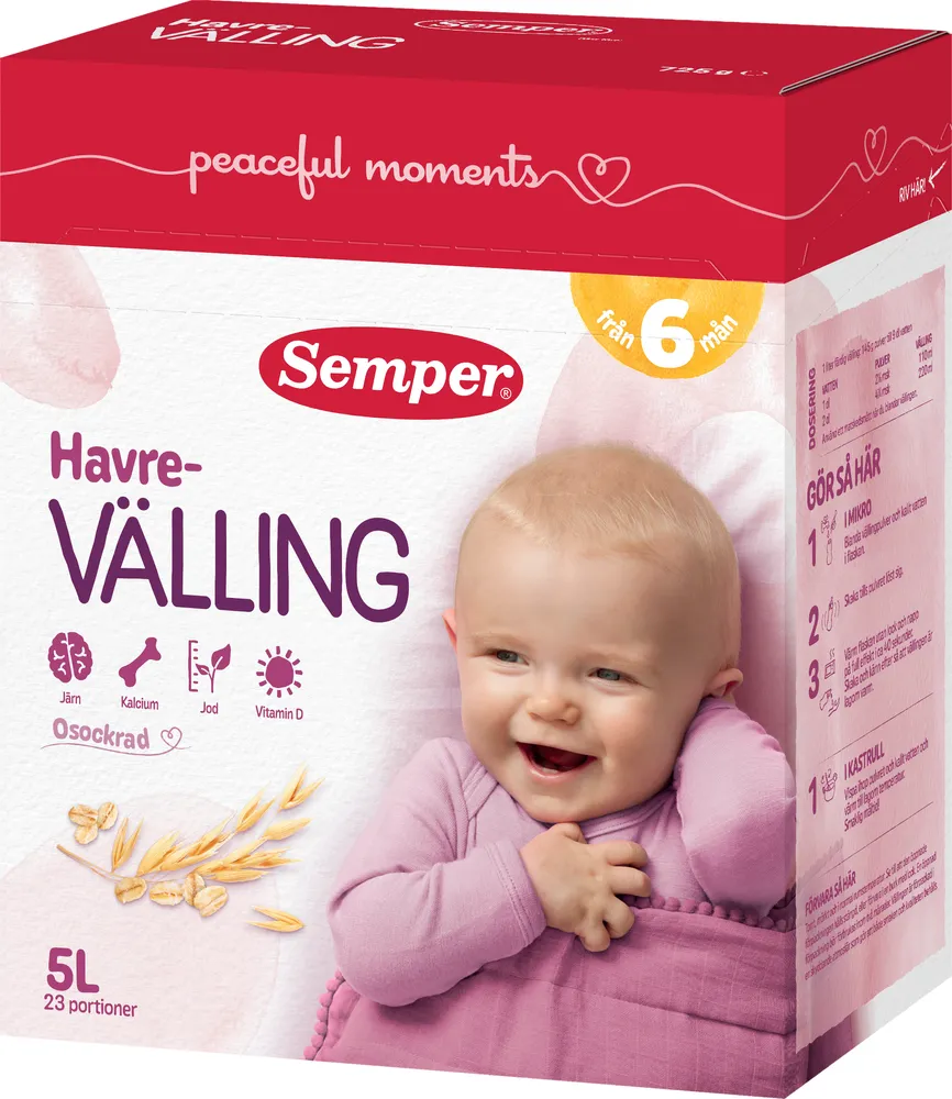 Välling förknippas ofta med en mysig stund på morgonen eller kvällen då man kryper upp i soffan tillsammans och njuter av närhet och lugn. Semper Havrevälling är mild och anpassad för barn från 6 månader. Havre har en god smak som barn ofta gillar, och innehåller dessutom en blandning av lösliga och olösliga fibrer. Våra vällingar från 6 månader har en lite högre fetthalt och lite lägre halt protein än vällingar från till exempel 1 år. Perfekt anpassat efter vad ditt barn behöver i åldern från 6 månader. Semper välling är alltid berikad. Med järn som bidrar till en normal utveckling av barns intellekt, jod som bidrar till barns normala tillväxt, kalcium som behövs för att ditt barns skelett ska växa som det ska, och vitamin D som bidrar till immunsystemets normala funktion hos barn. Tänk på att en mångsidig och balanserad kost är en viktig grund för sunda vanor. Vi tillsätter också fett i vår välling. Men bara rätt sorts fett. Semper välling innehåller fett från grädde, raps- och solrosolja. Det ger den en bra fettsammansättning med högt innehåll av omättat fett och en låg halt mättat fett. Det är vi stolta över.