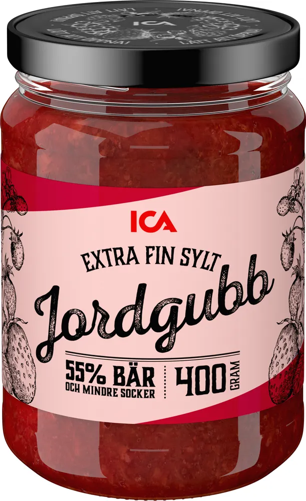 Jordgubbssylt Extra Fin tillverkas av ICA.