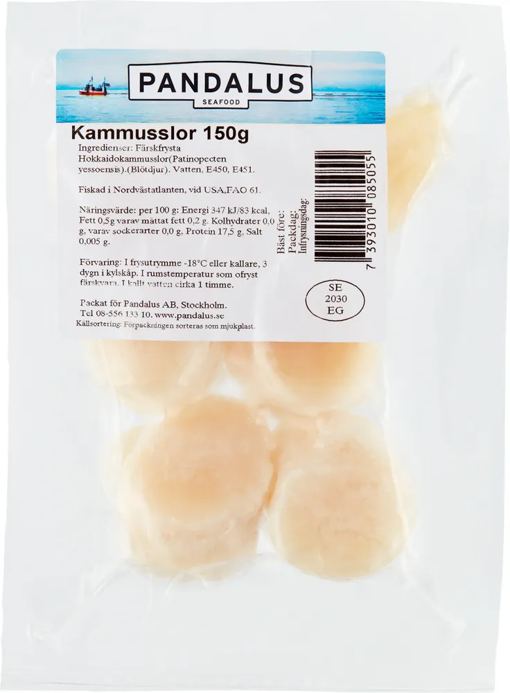 Ingredienser: Färksfrysta Kammusslor (placopecten magellanicus), fiskad i nordvästra atlanten vid USA, vatten, E 331, E451, salt.