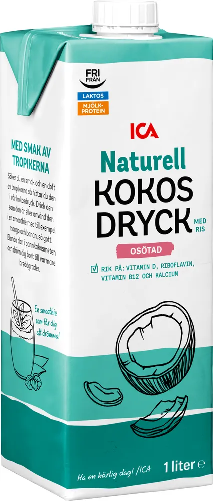 Ingredienser: Vatten, kokosmjölk 5,3%, ris 3,8%, förtjockningsmedel (E418, E412), surhetsreglerande medel (E341, E340), emulgeringsmedel (solroslecitin), salt, arom, vegetabiliskt vitamin D, riboflavin, vitamin B12.