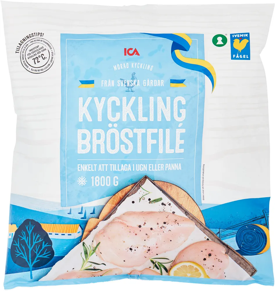 Kycklingbröstfilé* 87%, vatten, salt, socker. *Född, uppfödd, slaktad i Sverige. Kyckling- brösten är filéade med maskin. Var observant på att det kan förekomma delar av bröstbenet.