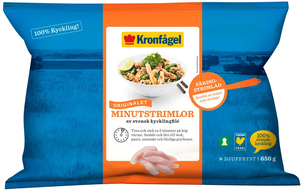 Minutstrimlor av svensk kycklingbröstfilé från Kronfågel har en härlig konsistens och smak. De passar perfekt i wokade rätter, till pasta, mustiga grytor och såser. Minutstrimlor tinas i kylskåp 5 timmar, före tillagning. Servera gärna med valfria tillbehör. Alltid svensk kyckling för en godare måltid.