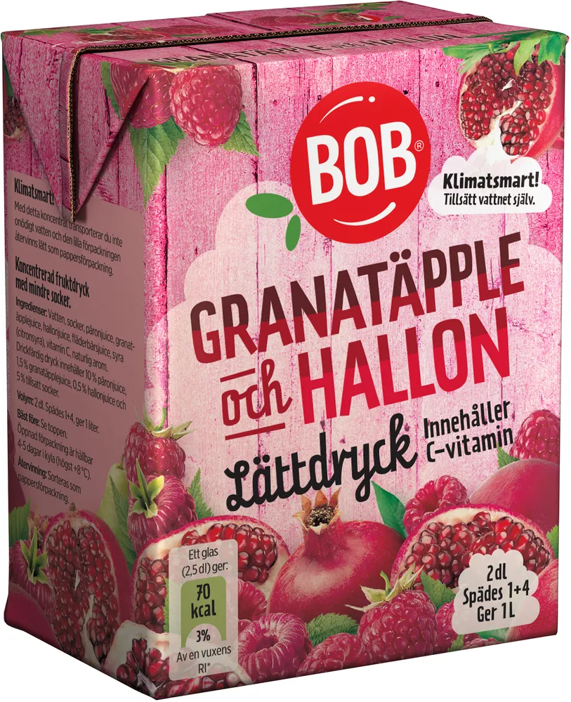 Lättdryck Granatäpple & Hallon tillverkas av BOB.