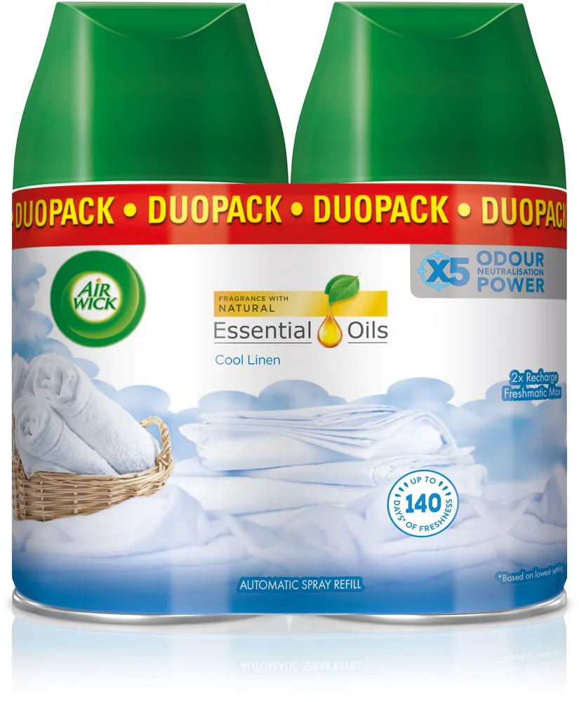 Air Wick Freshmatic Refill Cool Linen 250ml Doft av nytvättat och mandelblom Air Wick Freshmatic Automatic Spray är särskilt utformad för att ge ditt hem varaktig doft och 24/7 luktneuralisering. - Lättanvänd, sätt bara i sprayrefillen så släpper den batteridrivna enheten ut en fräsch, lätt doft med jämna mellanrum efter tidsinställning. - Du kan välja mellan tre tidsinställningar 7,5, 15 eller 30 minuter. Refill duo-pack till Air Wick Freshmatic Autospray Startkit.