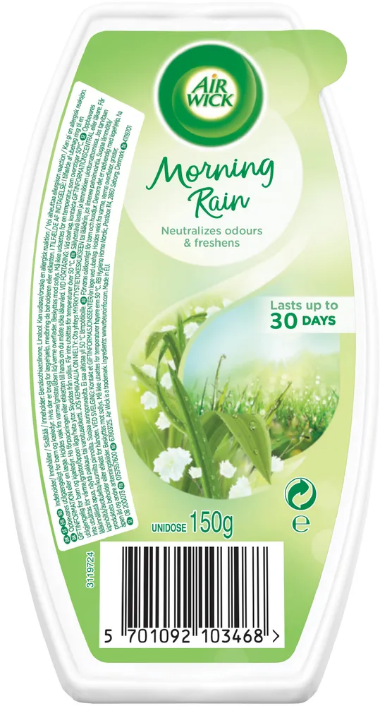 · Fräsch och lätt doft inspirerad av ett milt sommarregn · Tar bort lukter · Fräschar upp luften · Upp till 30 dagars kontinuerlig, effektiv väldoft Gelblock skapar en långvarig doft för att eliminera obehagliga lukter eller skapa väldoft. Ta bort plastfilmen och ställ den upprätt på ett jämnt underlag. Sprider en jämn doft i upp till 30 dagar.