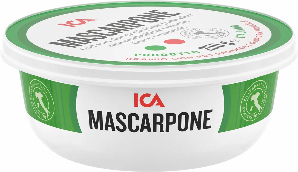 Mascarpone ifrån varumärket ICA. Krämig och fet färskost gjord på komjölk. Mascarpone är god som den är till färsk frukt eller som smakhöjare i risotto. En given ingrediens i tiramisu.