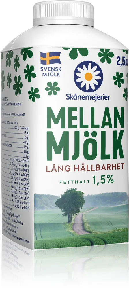 Mellanmjölk 1,5% tillverkas av Skånemejerier.