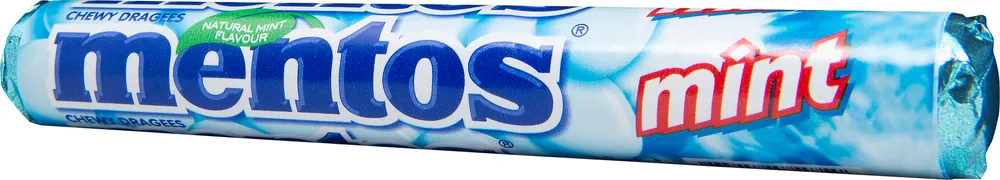 Mentos med mintsmak är tuggvänliga godistabletter som fräschar upp andedräkten. Tabletterna är ovalformade med ett hårt skal och mjuk kärna.