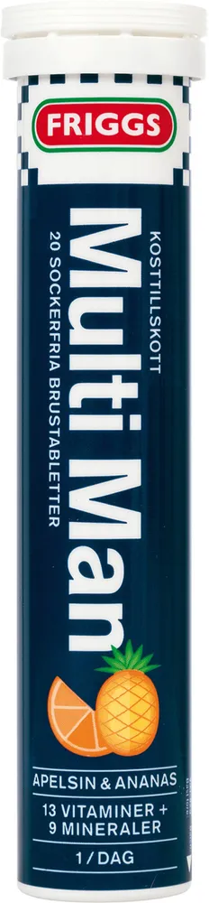 Friggs Multivitamin Man brustabletter innehåller 13 vitaminer och 9 mineraler som är särskilt anpassad för dig som man. Sockefria brustabletter med god smak av apelsin och ananas. Löses snabbt i vatten.