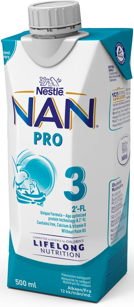 Nestlé NAN PRO 3 är en drickfärdig mjölkdryck anpassad efter näringsbehoven hos friska barn från 12 månader som en del av en varierad kost. NAN PRO 3 är den enda mjölkdrycken för småbarn i Sverige som består av en unik sammansättning av åldersanpassad proteinteknologi och oligosackariden 2'-FL (2'-fukosyllaktos), en syntetiskt framställd oligosackarid som strukturellt är identisk med den vanligaste oligosackariden i modersmjölk. NAN PRO 3 är en näringsrik mjölkdryck som kan vara ett alternativ till eller ersättning för vanlig mjölk som en del av barnets kost. NAN PRO 3 för barn från 12 månader är baserad på mer än 60 års forskning om modersmjölk. Visste du att proteiner bör anpassas till ditt barn? Forskning visar att proteiner är en av de viktigaste näringsämnena för barn, även efter det första levnadsåret. Hos de flesta småbarn är proteinintaget för högt och det rekommenderas att begränsa intaget. NAN PRO 3 är speciellt utvecklad för att möta näringsbehoven hos småbarn och är producerad med vår åldersanpassade proteinteknologi som ger lämplig proteinkvalitet. Nestlé förbinder sig till vetenskapen om barns livslånga näring för att kunna erbjuda de senaste innovationerna som vår forskning har att erbjuda. NAN PRO 3 är speciellt utvecklad för barn från 12 månader och är baserad på denna forskning. '- ÅLDERSANPASSAD PROTEINTEKNOLOGI är en unik proteinteknologi som ger optimalt åldersanpassad proteinkvalitet för ditt barn. '- INNEHÅLLER OLIGOSACKARIDEN 2'-FL (2'-fukosyllaktos), en syntetiskt framställd oligosackarid som är strukturellt identisk med den vanligaste oligosackariden i modersmjölk. '- INNEHÅLLER JÄRN. NAN PRO 3 är en bra källa till järn som bidrar till en normal kognitiv utveckling hos barn.* '- INNEHÅLLER D-VITAMIN & KALCIUM. NAN PRO 3 innehåller vitamin D och kalcium som är nödvändiga för att barns benstomme ska växa och utvecklas normalt. D-vitamin bidrar också till immunsystemets normala funktion hos barn.* '- INNEHÅLLER ALA (α-linolensyra - en av Omega 3-fettsyrorna) och LA (linolsyra - en av Omega 6-fettsyrorna), de essentiella fettsyrorna som är nödvändiga för normal tillväxt och utveckling hos barn.** Samtidigt har produkten lågt innehåll av mättat fett. *Kom ihåg att en varierad och balanserad kost och en hälsosam livsstil är viktigt för barnet. **Den gynnsamma effekten uppnås vid ett dagligt intag på 2 g α-linolensyra (ALA) och ett dagligt intag på 10 g linolsyra (LA). Vi arbetar också med initiativ för att bidra till att skydda miljön för kommande generationer*** '- Förpackningen är återvinningsbar. '- Endast förnybar el används på fabriken där NAN PRO 3 produceras. '- Vi stödjer initiativ på gårdar över hela världen för att minska CO2-utsläppen från mjölkingredienser***. ***Läs mer på www.nestle.com/sustainability Produkten är halalanpassad, men inte halal-certifierad. NAN PRO 3 finns både som pulver och drickfärdig version. Hitta NAN PRO 3 pulver här (länk till NAN PRO 3 800g pulver). VIKTIGT! NAN PRO 3 är inte en modersmjölksersättning utan en mjölkdryck speciellt utvecklad för småbarn som är 12 månader och äldre. Du bör amma barnet så länge som möjligt. Kontakta gärna BVC för att få råd. Observera att produktsammansättningen kan ändras - läs alltid ingredienslistan på förpackningen innan du serverar mjölkdrycken.
