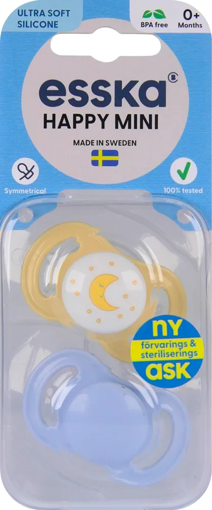ESSKA Happy Mini är en mini-variant av vår populära Happy-napp. Happy Mini är perfekt som första napp för nyfödda då den mindre sugdelen och skölden är anpassade till de allra minsta. Happy Mini alltid rättvänd tack vare sin symmetriska form och konstruerad med välventilerad sköld för att vara snäll mot ditt barns känsliga hud. Dessutom syns ditt barns underbara leende. Den symmetriska sugdelen är gjord i slitstarkt silikon av högsta medicinska kvalitet, vilket passar bra för vardagens alla små äventyr. Silikon är smak- och doftfritt, lätt att hålla ren, åldras inte och ändrar inte form. ESSKA Happy Mini köps här som 2-pack i en praktisk förvarings- och steriliseringsbox som gör det enkelt att sterilisera napparna i mikron. Alla ESSKA-nappar tillverkas i Lidköping, Sverige, är fria från BPA och uppfyller europeisk standard EN-1400:2013+A2:2018.