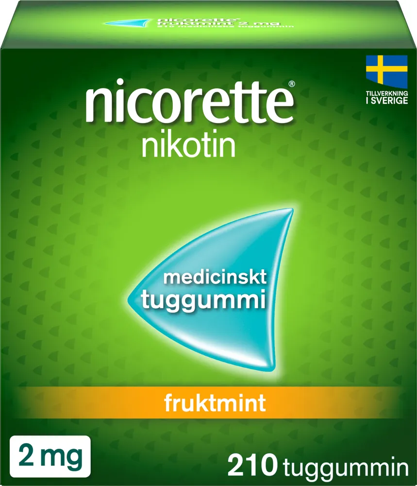 Nicorette nikotintuggummi är för dig som vill sluta röka och bli rök och nikotinfri, även från nikotinläkemedel. Nicorette tuggummi tillverkas i Helsingborg sedan 1978 och är Sveriges mest köpta nikotintuggummi. Nicorette tuggummi är kliniskt bevisat att lindra röksug, nikotinbegär samt abstinenssymtom såsom ångest, irritation och ökad aptit. Nicorette tuggummi finns i fyra olika smaker; fruktmint, pepparmint, mentolmint och en neutral smak. Nicorette® tuggummi finns också i två olika styrkor, 2 mg för dig som röker färre än 20 cigaretter per dag och 4 mg för dig som röker fler än 20 cigaretter per dag. Regelbunden användning länge än 12 månader rekommenderas normalt inte och behandlingen bör pågå minst 3 månader, därefter bör antalet tuggummin per dag trappas ner. För att maximera chanserna att lyckas är det viktigt att inte underdosera. För extra stöd vid högt nikotinbegär (om du röker fler än 20 cigaretter per dag eller tidigare misslyckats att sluta röka) – kombinera Nicorette plåster och 2 mg tuggummi för att öka dina chanser att lyckas sluta (jämfört med om du endast använt ett nikotinläkemedel). Plåster ger kontinuerligt stöd under dygnets vakna timmar medan nikotintuggummi lindrar akuta toppar av röksug när det slår till. Funderar du på att sluta röka med hjälp av snus? Prova istället Nicorette tuggummi!