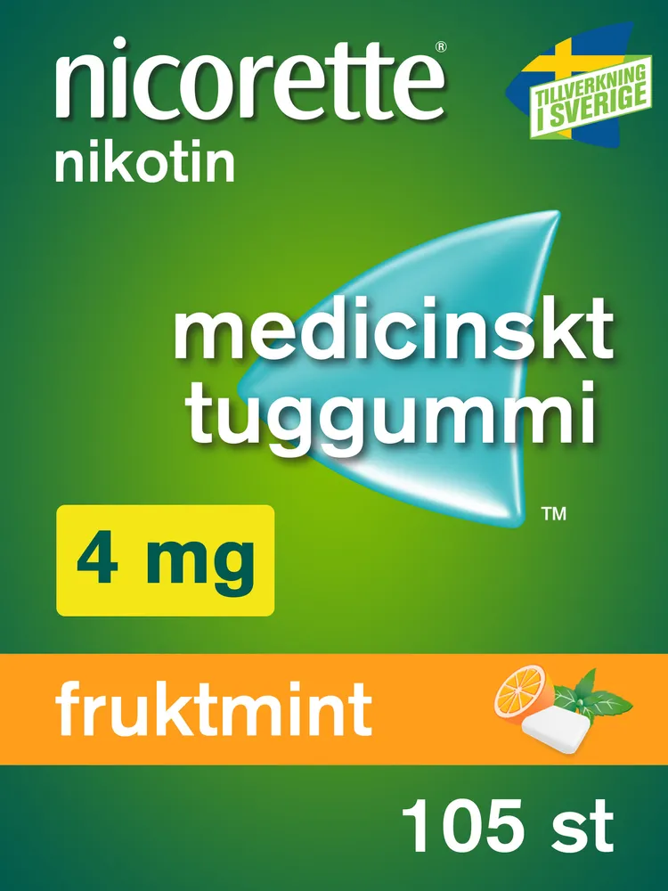 Nicorette nikotintuggummi är för dig som vill sluta röka och bli rök och nikotinfri, även från nikotinläkemedel. Nicorette tuggummi tillverkas i Helsingborg sedan 1978 och är Sveriges mest köpta nikotintuggummi. Nicorette tuggummi är kliniskt bevisat att lindra röksug, nikotinbegär samt abstinenssymtom såsom ångest, irritation och ökad aptit. Nicorette tuggummi finns i fyra olika smaker; fruktmint, pepparmint, mentolmint och en neutral smak. Nicorette® tuggummi finns också i två olika styrkor, 2 mg för dig som röker färre än 20 cigaretter per dag och 4 mg för dig som röker fler än 20 cigaretter per dag. Regelbunden användning länge än 12 månader rekommenderas normalt inte och behandlingen bör pågå minst 3 månader, därefter bör antalet tuggummin per dag trappas ner. För att maximera chanserna att lyckas är det viktigt att inte underdosera. För extra stöd vid högt nikotinbegär (om du röker fler än 20 cigaretter per dag eller tidigare misslyckats att sluta röka) – kombinera Nicorette plåster och 2 mg tuggummi för att öka dina chanser att lyckas sluta (jämfört med om du endast använt ett nikotinläkemedel). Plåster ger kontinuerligt stöd under dygnets vakna timmar medan nikotintuggummi lindrar akuta toppar av röksug när det slår till. Funderar du på att sluta röka med hjälp av snus? Prova istället Nicorette tuggummi!