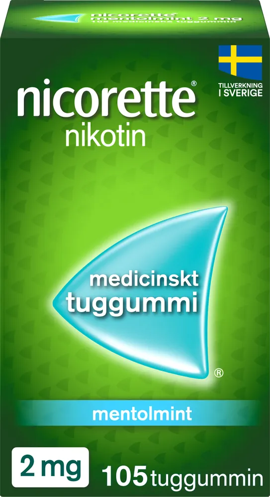 Nicorette nikotintuggummi är för dig som vill sluta röka och bli rök och nikotinfri, även från nikotinläkemedel. Nicorette tuggummi tillverkas i Helsingborg sedan 1978 och är Sveriges mest köpta nikotintuggummi. Nicorette tuggummi är kliniskt bevisat att lindra röksug, nikotinbegär samt abstinenssymtom såsom ångest, irritation och ökad aptit. Nicorette tuggummi finns i fyra olika smaker; fruktmint, pepparmint, mentolmint och en neutral smak. Nicorette tuggummi finns också i två olika styrkor, 2 mg för dig som röker färre än 20 cigaretter per dag och 4 mg för dig som röker fler än 20 cigaretter per dag. Regelbunden användning länge än 12 månader rekommenderas normalt inte och behandlingen bör pågå minst 3 månader, därefter bör antalet tuggummin per dag trappas ner. För att maximera chanserna att lyckas är det viktigt att inte underdosera. För extra stöd vid högt nikotinbegär (om du röker fler än 20 cigaretter per dag eller tidigare misslyckats att sluta röka) – kombinera Nicorette plåster och 2 mg tuggummi för att öka dina chanser att lyckas sluta (jämfört med om du endast använt ett nikotinläkemedel). Plåster ger kontinuerligt stöd under dygnets vakna timmar medan nikotintuggummi lindrar akuta toppar av röksug när det slår till. Funderar du på att sluta röka med hjälp av snus? Prova istället Nicorette tuggummi!