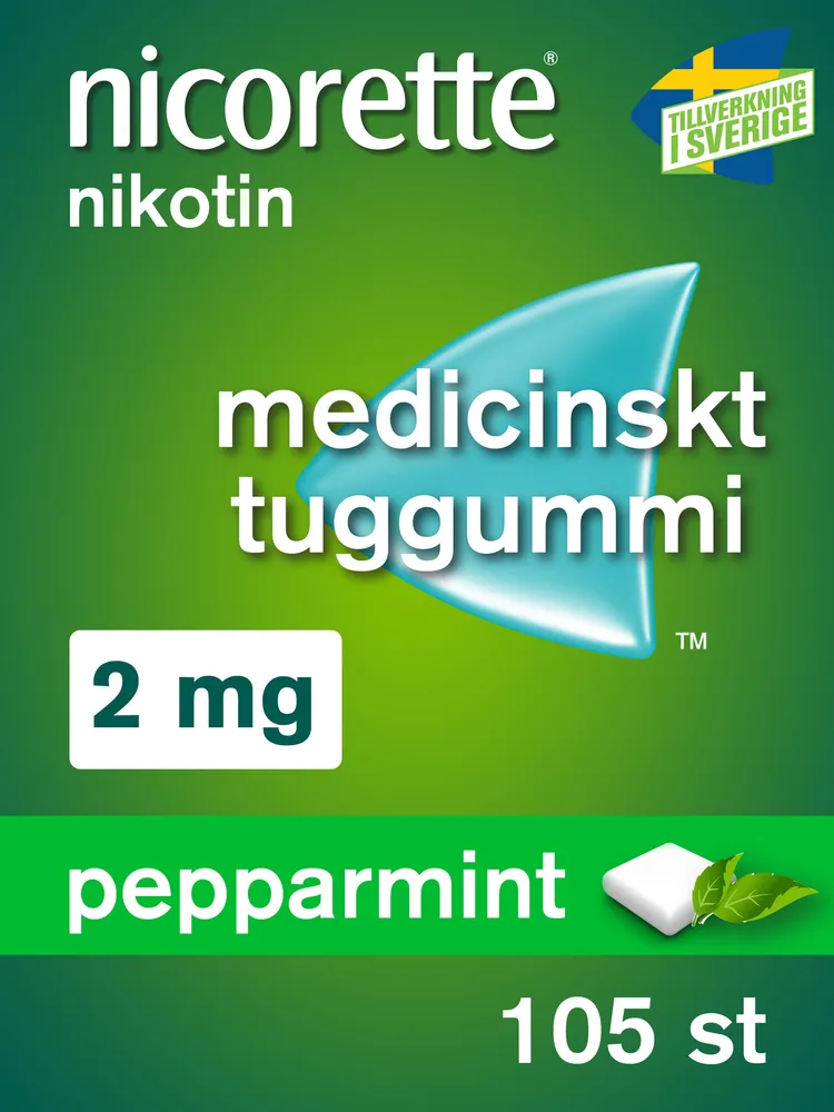 Nicorette nikotintuggummi är för dig som vill sluta röka och bli rök och nikotinfri, även från nikotinläkemedel. Nicorette tuggummi tillverkas i Helsingborg sedan 1978 och är Sveriges mest köpta nikotintuggummi. Nicorette tuggummi är kliniskt bevisat att lindra röksug, nikotinbegär samt abstinenssymtom såsom ångest, irritation och ökad aptit. Nicorette tuggummi finns i fyra olika smaker; fruktmint, pepparmint, mentolmint och en neutral smak. Nicorette tuggummi finns också i två olika styrkor, 2 mg för dig som röker färre än 20 cigaretter per dag och 4 mg för dig som röker fler än 20 cigaretter per dag. Regelbunden användning länge än 12 månader rekommenderas normalt inte och behandlingen bör pågå minst 3 månader, därefter bör antalet tuggummin per dag trappas ner. För att maximera chanserna att lyckas är det viktigt att inte underdosera. För extra stöd vid högt nikotinbegär (om du röker fler än 20 cigaretter per dag eller tidigare misslyckats att sluta röka) – kombinera Nicorette plåster och 2 mg tuggummi för att öka dina chanser att lyckas sluta (jämfört med om du endast använt ett nikotinläkemedel). Plåster ger kontinuerligt stöd under dygnets vakna timmar medan nikotintuggummi lindrar akuta toppar av röksug när det slår till. Funderar du på att sluta röka med hjälp av snus? Prova istället Nicorette tuggummi!