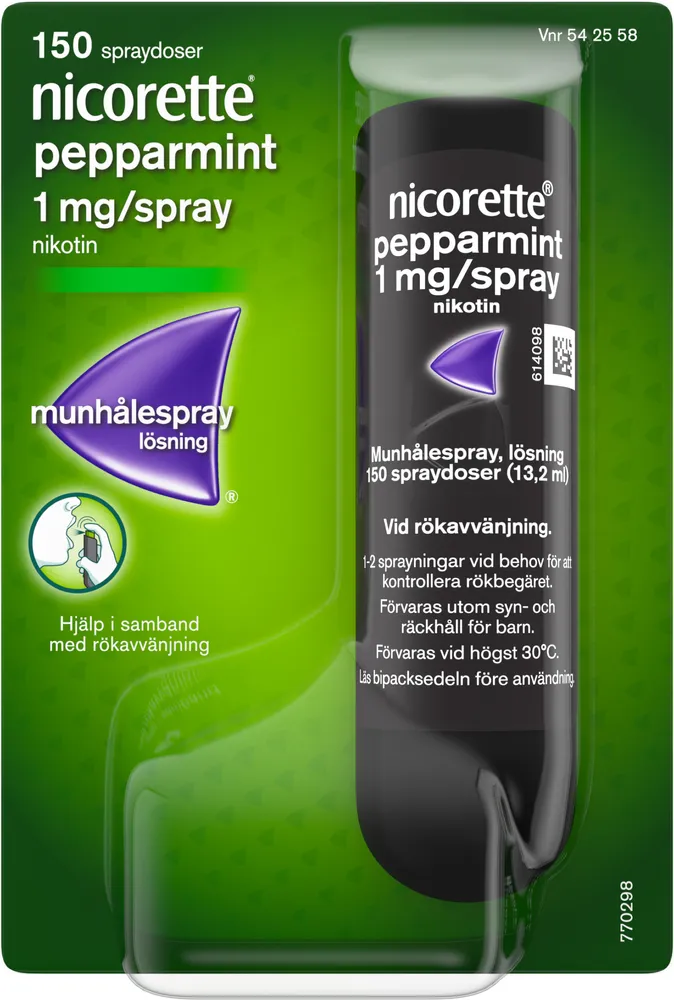 Nicorette Pepparmint, munhålespray, lösning 1 mg/spray 150 doser tillverkas av Nicorette®.